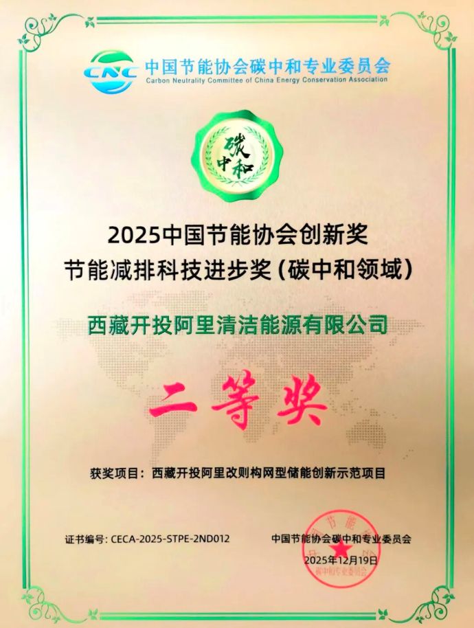 近日,由中國質(zhì)量認(rèn)證中心、中國節(jié)能協(xié)會(huì)碳中和專業(yè)委員會(huì)聯(lián)合頒發(fā)的2025中國節(jié)能協(xié)會(huì)創(chuàng)新獎(jiǎng)名單揭曉,由西藏開投阿里清潔能源公司投資建設(shè)的阿里改則構(gòu)網(wǎng)型儲(chǔ)能創(chuàng)新示范項(xiàng)目獲“節(jié)能減排科技進(jìn)步獎(jiǎng)(碳中和領(lǐng)域)二等獎(jiǎng)”。