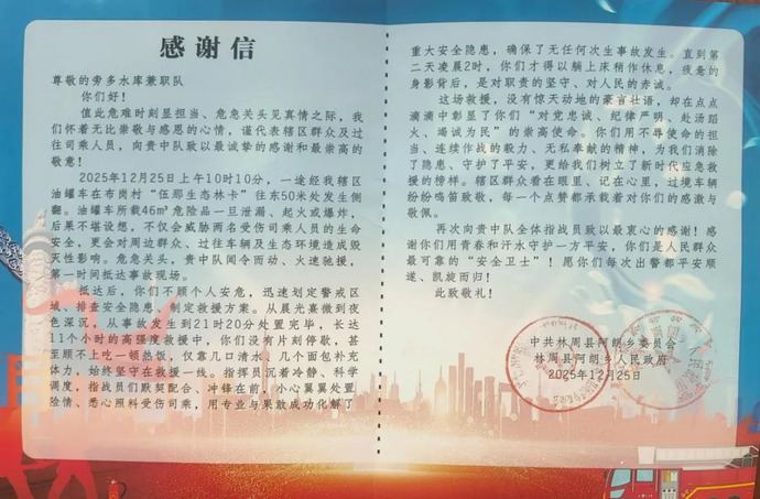 2025年12月25日上午,一輛載有46立方米危化品的油罐車在阿朗鄉(xiāng)布崗村發(fā)生側(cè)翻,司乘人員受傷,?;反嬖谛孤⑷急卮箫L(fēng)險(xiǎn),嚴(yán)重威脅人民群眾生命財(cái)產(chǎn)及周邊生態(tài)環(huán)境安全。接報(bào)后,公司兼職消防隊(duì)聞令而動(dòng)、火速馳援,第一時(shí)間抵達(dá)現(xiàn)場(chǎng)開(kāi)展處置。