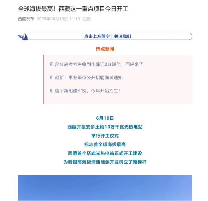 6月10日,全球海拔最高、西藏首個塔式光熱項目——西藏開投安多土碩100MW光熱電站正式開工建設的消息,被人民網、新華網、央視、光明日報、經濟日報、科技日報、中國新聞網、中國西藏網、中國發(fā)展網、西藏發(fā)布、西藏日報、西藏廣播電視臺、西藏商報、安多縣廣播電視臺等各級媒體平臺宣傳報道,有力提升了集團品牌影響力和產業(yè)發(fā)展的傳播力。