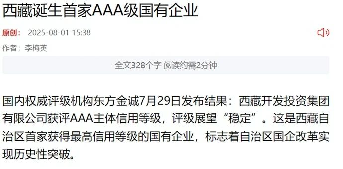 媒體報(bào)道丨西藏誕生首家AAA級(jí)國(guó)有企業(yè)